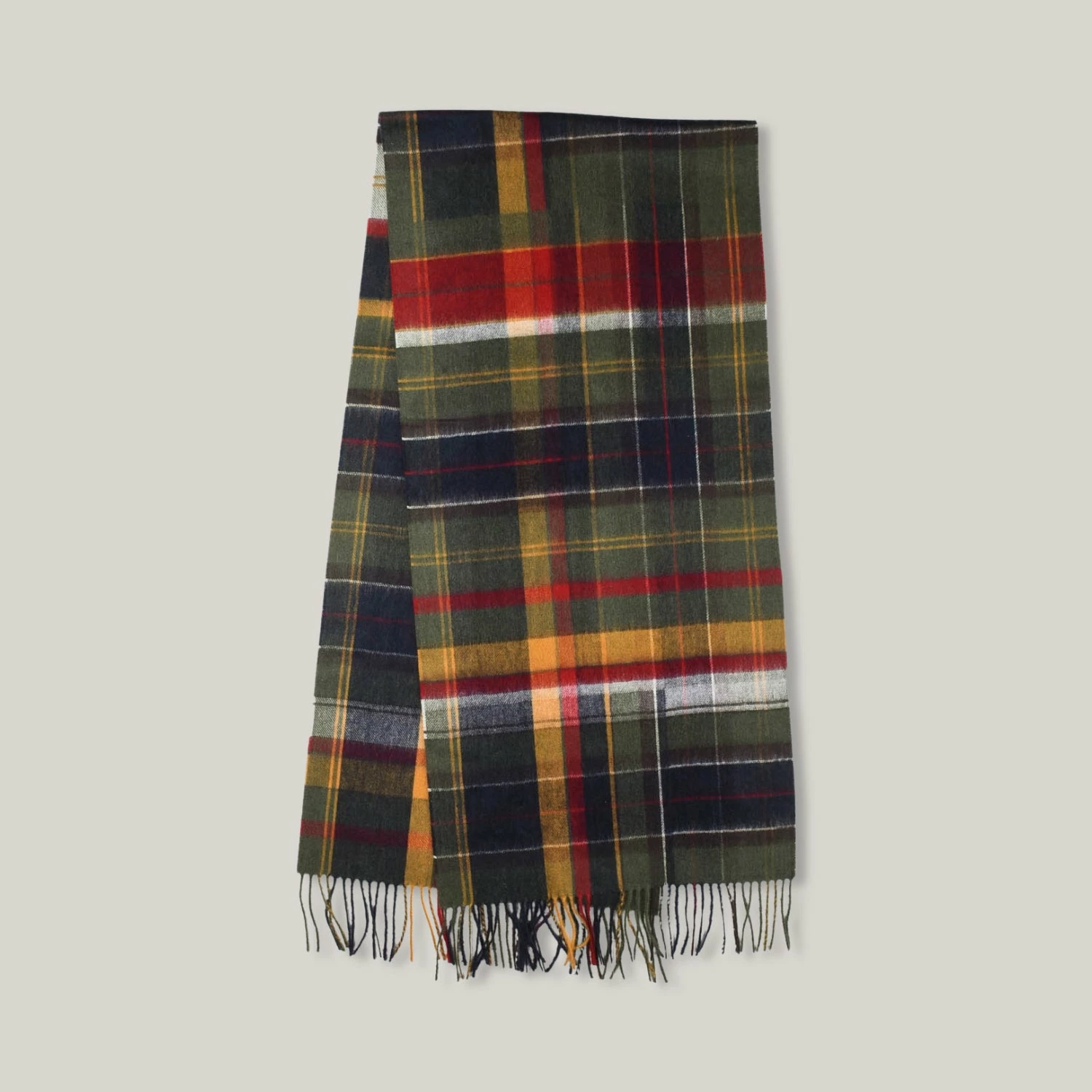 Soft, large lambswool scarf in a classic tartan with patchwork notes of other tartans added into the mix. Tasselled finish.