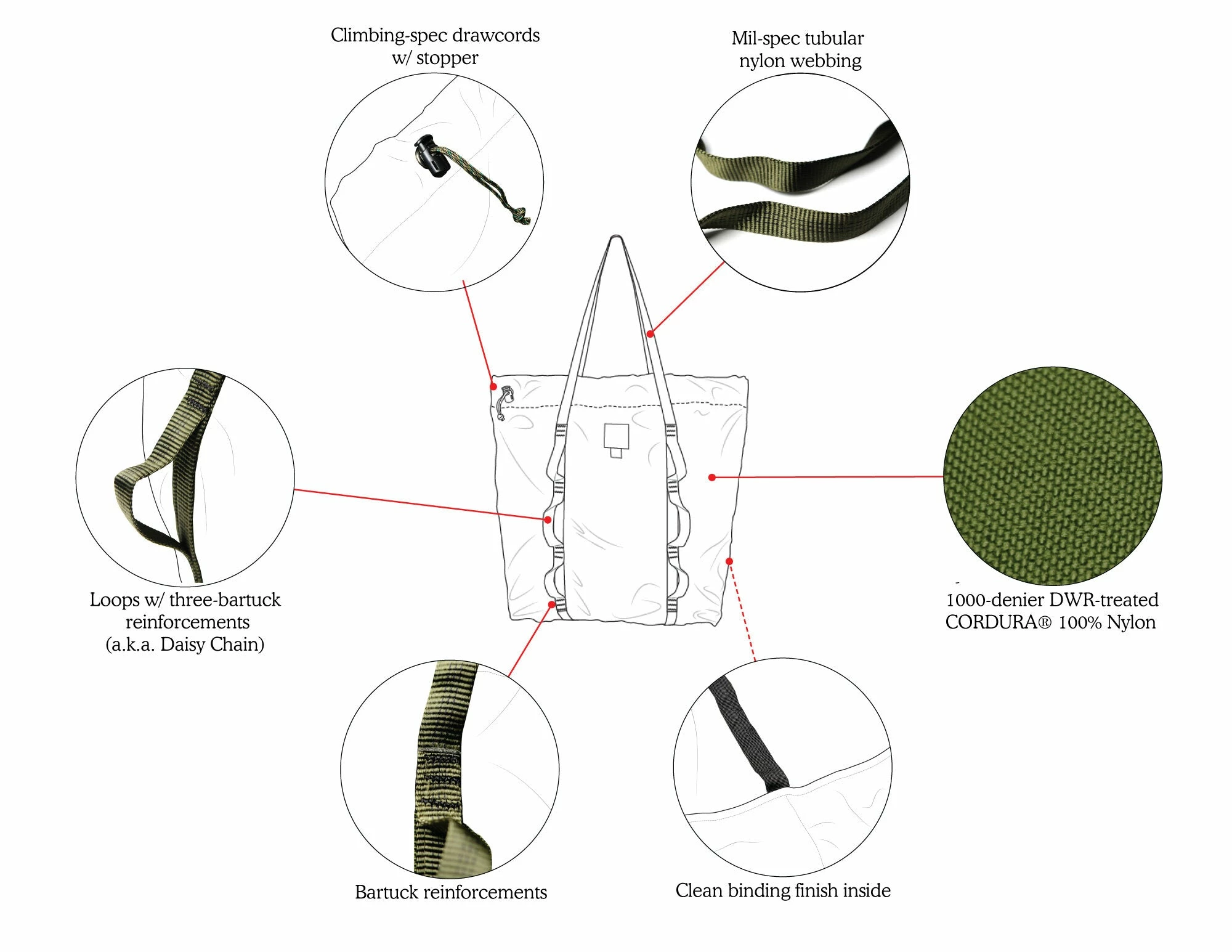 EM’s Climb Tote embodies the casual coolness and beauty of a classic tote embellished with rock climbing ‘daisy chain’ using mil-spec tubular nylon webbing to prominently standout from other tote bags. The specs of the daisy chain (a chain of small loops reinforced with bar-tacks) are identical to the requirement on true climbing equipment.