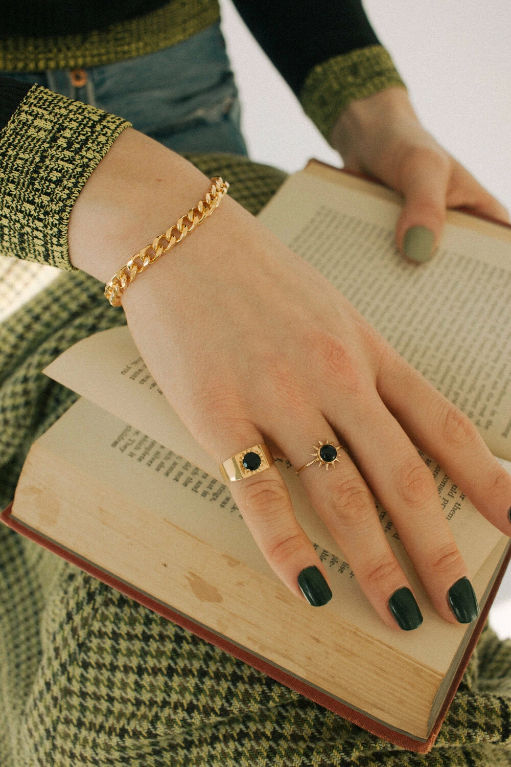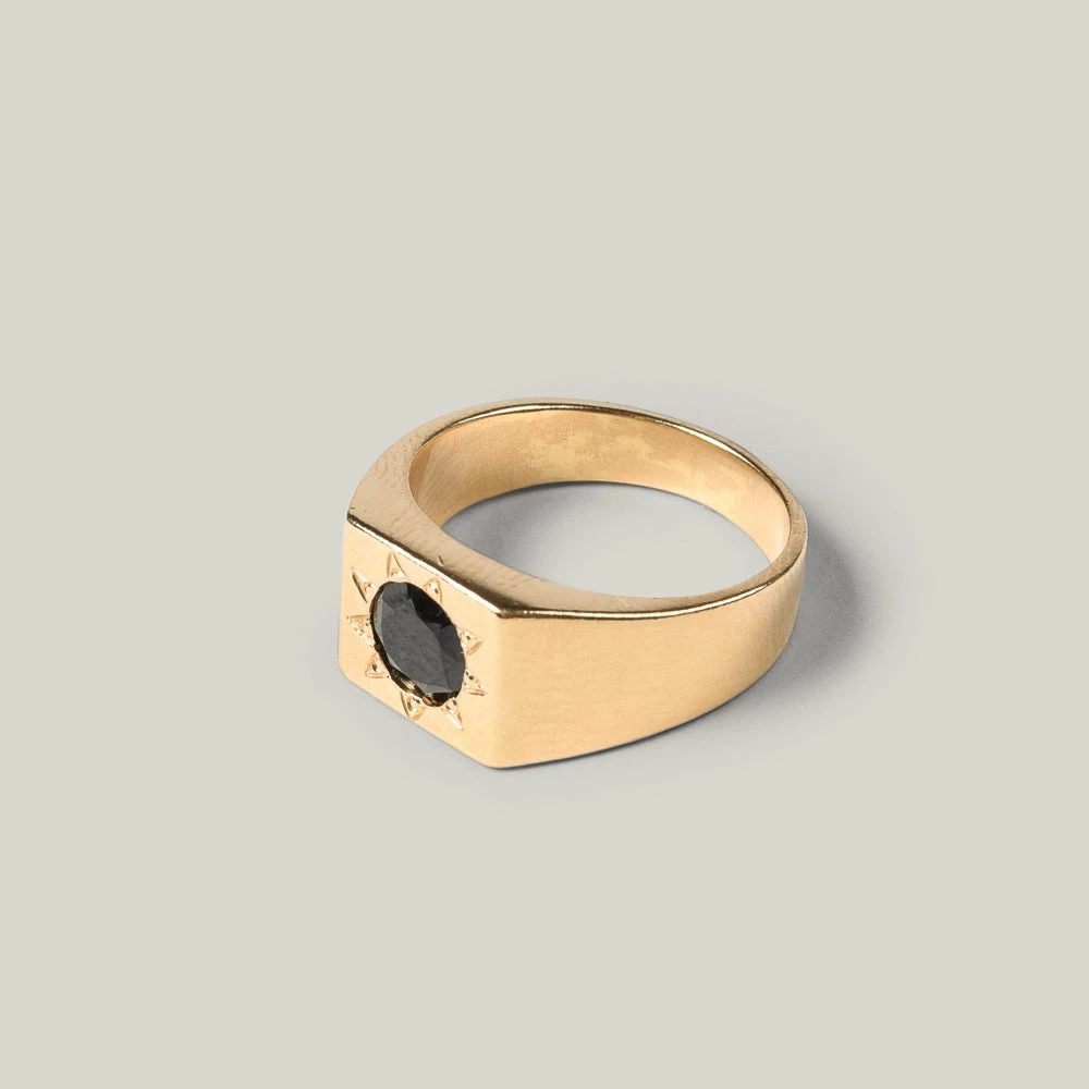 The Townes Signet is made using a 6mm black onyx stone, and gold plated brass. All Merewif gold plated jewellery is 100% brass, using a much thicker gold plate than the industry standard, and once the pieces are plated, a protective finish is added to prolong the life of the gold plate.