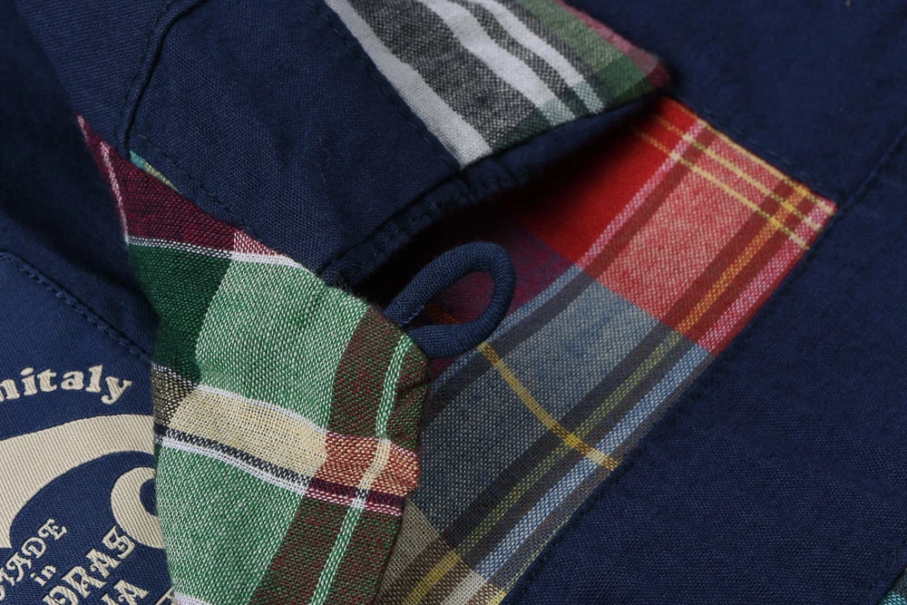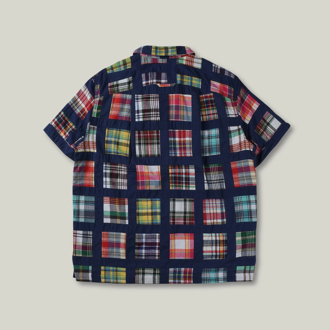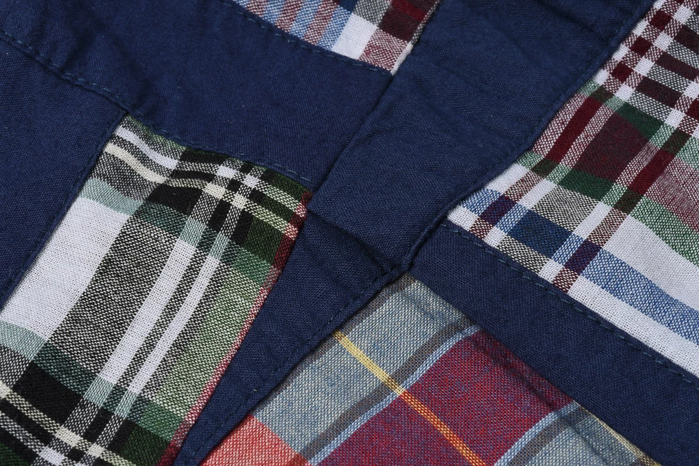 A special collaboration with their partner factory in Madras, India. Their long-term favourite fabric – the original Madras Plaid – is gathered in various design and colours in order to custom-make this patchwork fabric. Unlike the usual patchwork fabrics, theirs is incorporated in the solid navy frame. Details include fully lined in navy cotton, an open collar and side seam slits for ease of movement. Also, twin chest pockets that have been carefully produced to line up with the framed fabric, an absolute cracker.