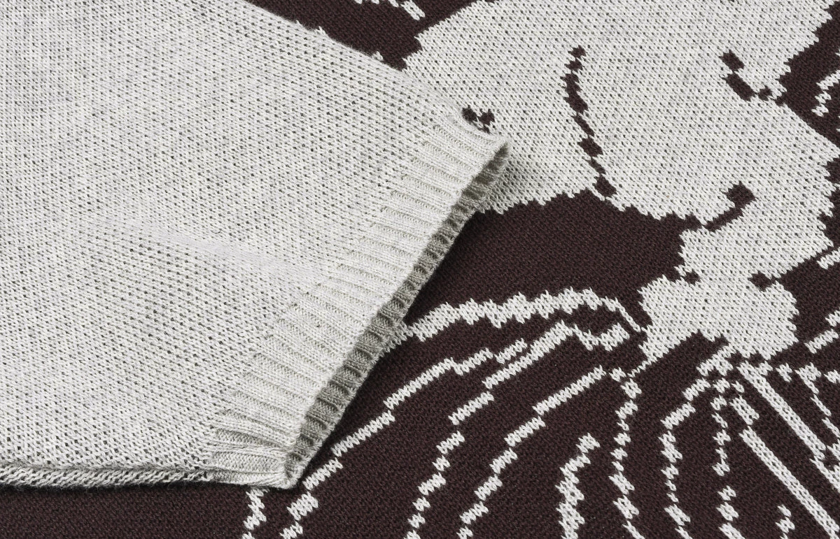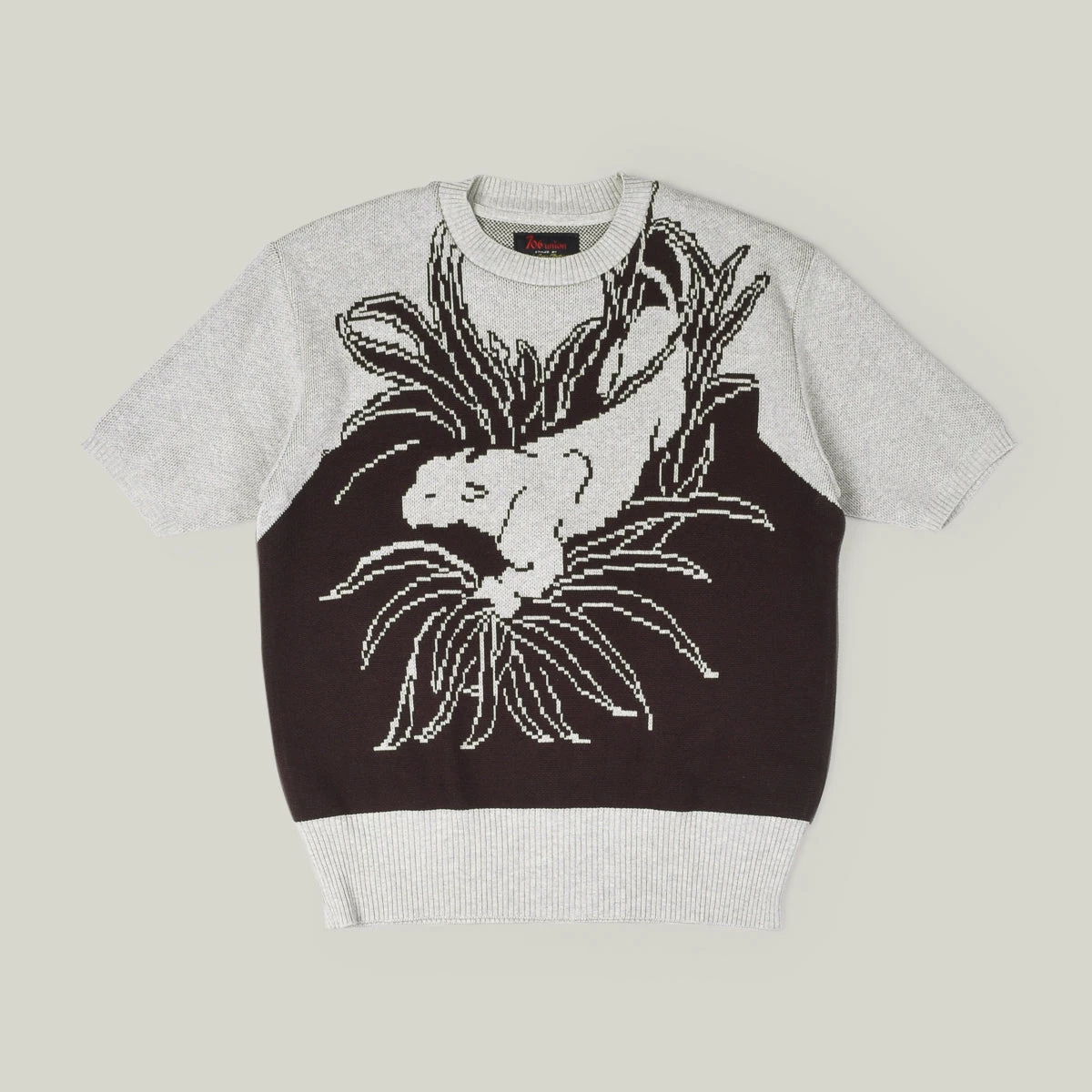 From tiny Japanese holders 706 Union, is this vintage-style short sleeved cotton knit with panther intarsia design on the front. Usually made in wool, this is a heavy knit cotton.ย