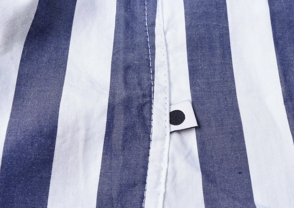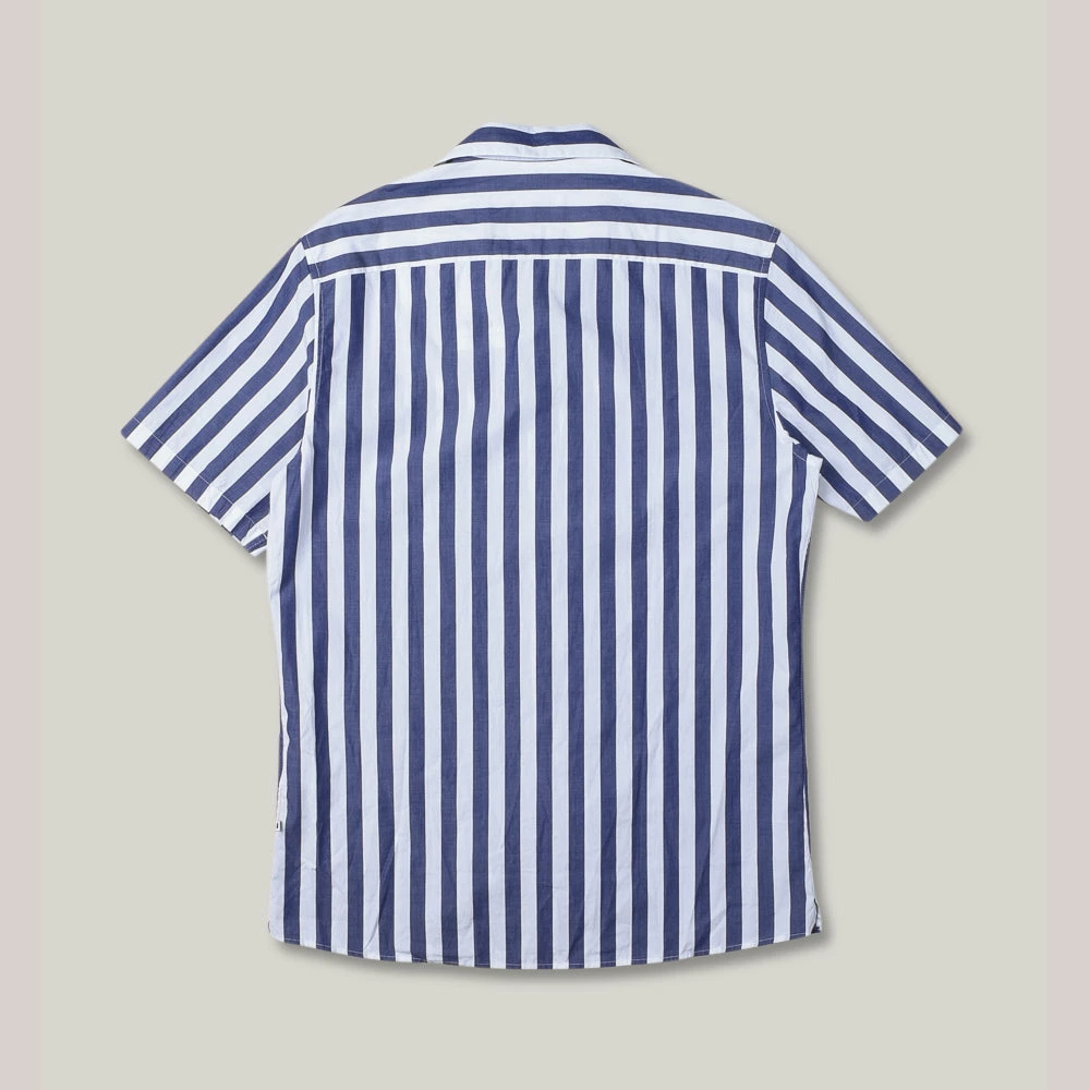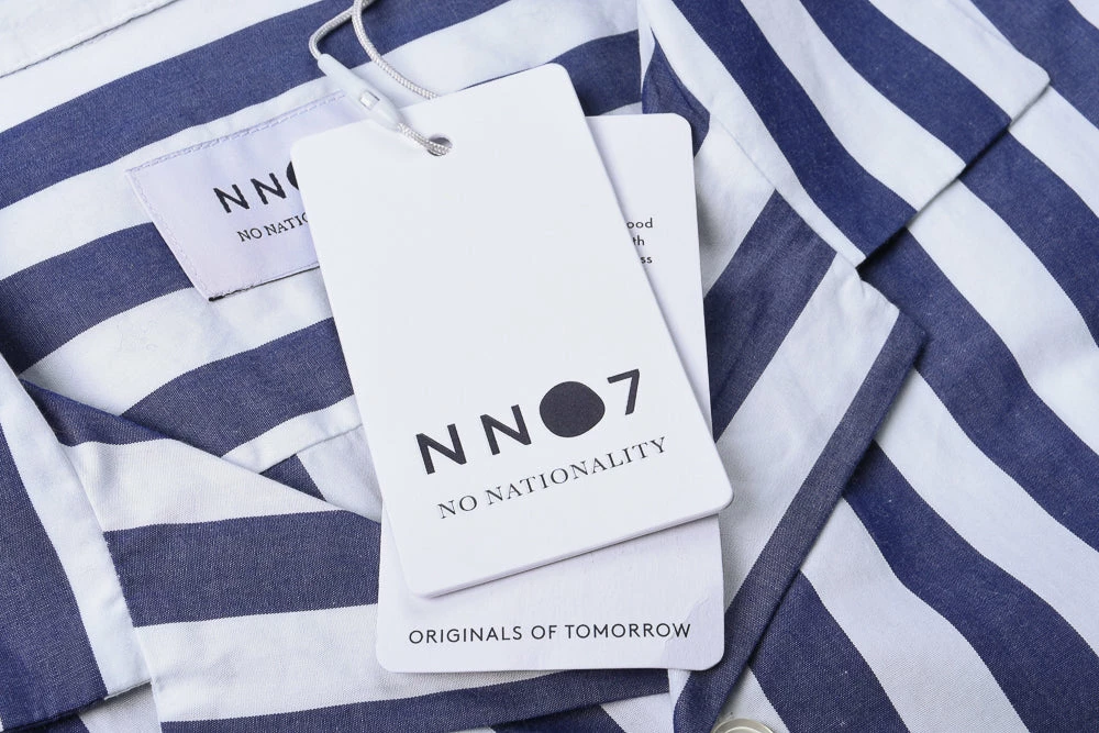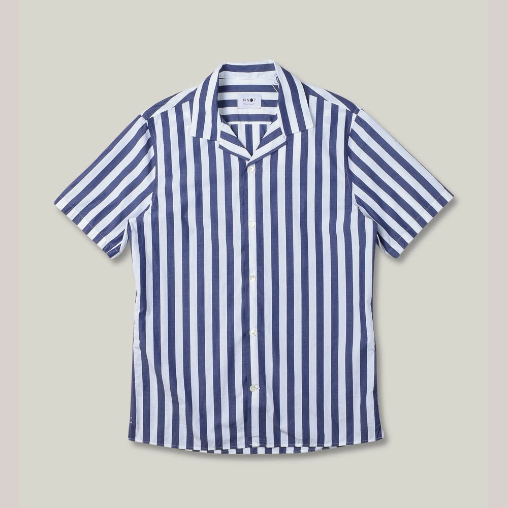 Classic camp collar number from the Scandinavian brand No Nationality, made in a lightweight striped cotton of white and blue. Details include split side hems and pearlescent buttons.