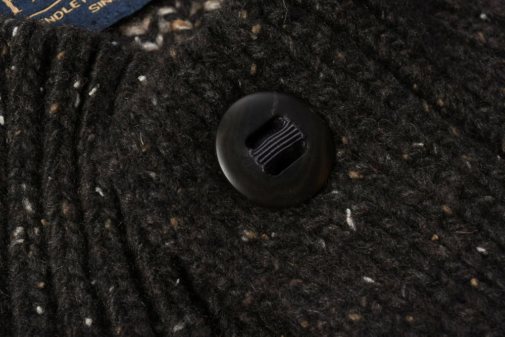 Warm campfire favourite Pendleton gives this woollen mix cardigan in dark chocolate brown with coloured flecks and chunky double-eyelet buttons. Details include moleskin elbow patches and border stripe detail on bottom hem.