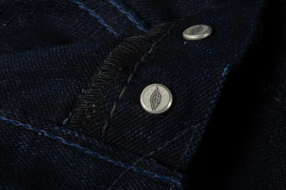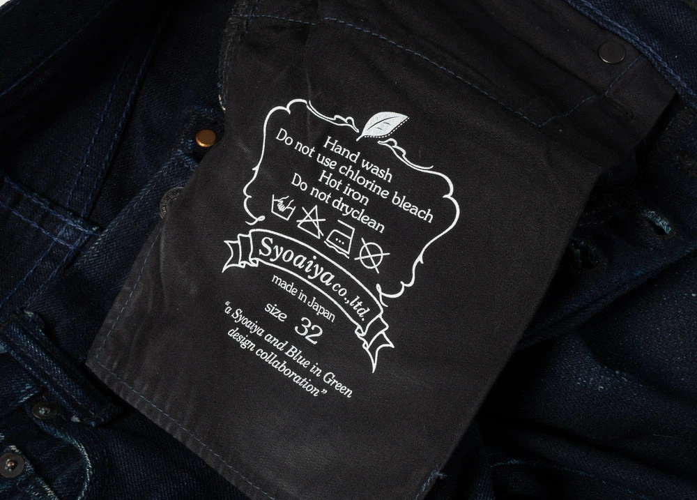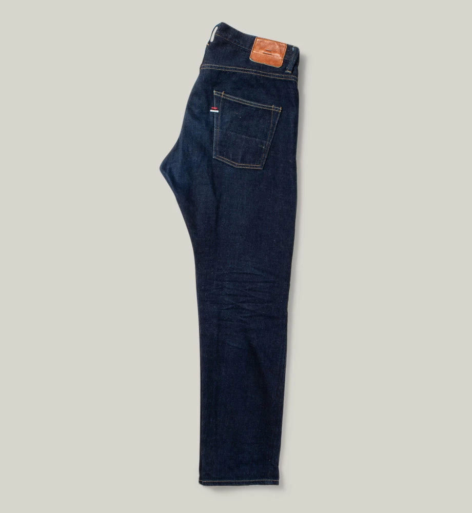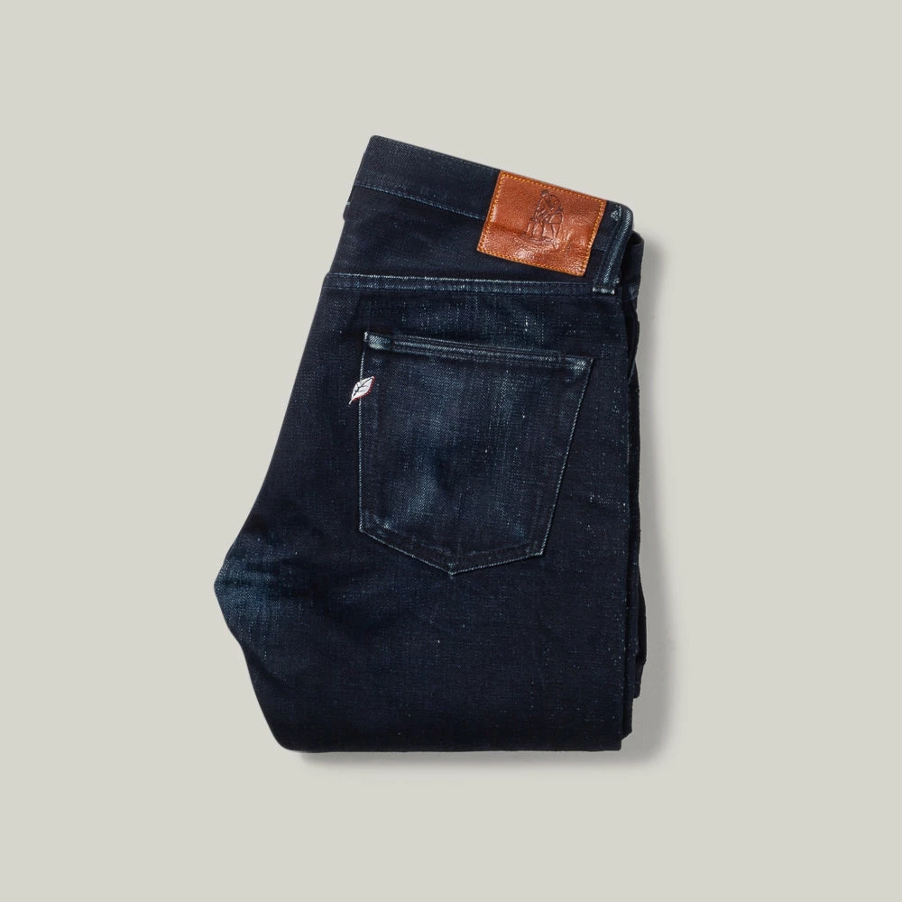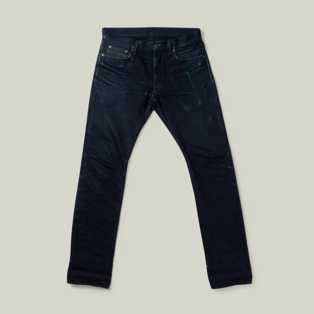 Double indigo slim tapered jeans from a collaboration between Pure Blue and Blue in Green from NY. The denim is a slubby, super dark 14oz denim and details include deerskin leather patch, herringbone cotton pocket linings, black hardware and blue selvedge detail.ย