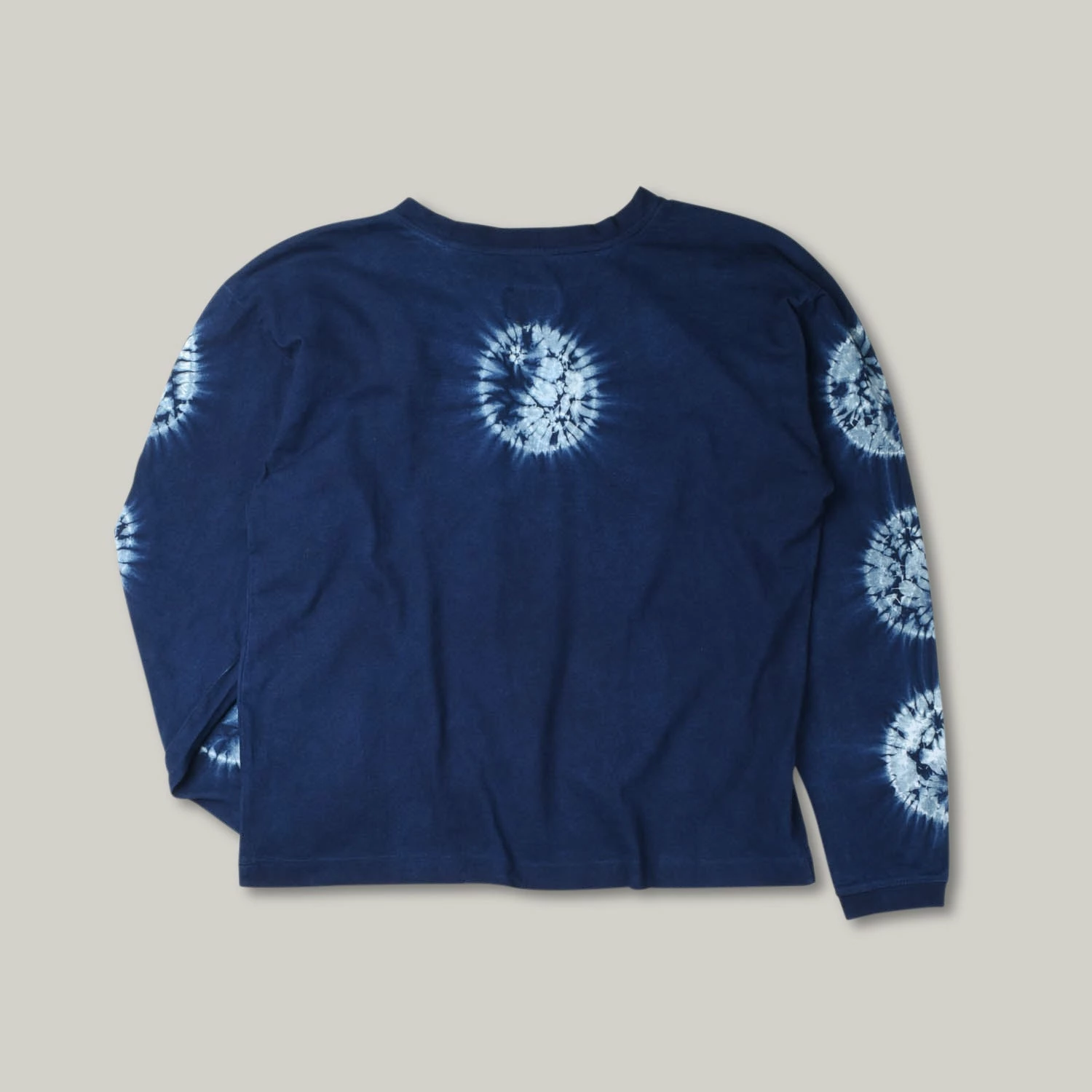 Using a superior Japanese knitted cotton by Lauren’s favourite knitwear mill in Wakayama, of Kansai Provence, this fabric is produced by old machines that tick over slowly, making a soft, supple garment that feels lovely against the skin and ages beautifully. Furthermore, these have been hand stitched and dyed using natural indigo, then screen-printed on the front.